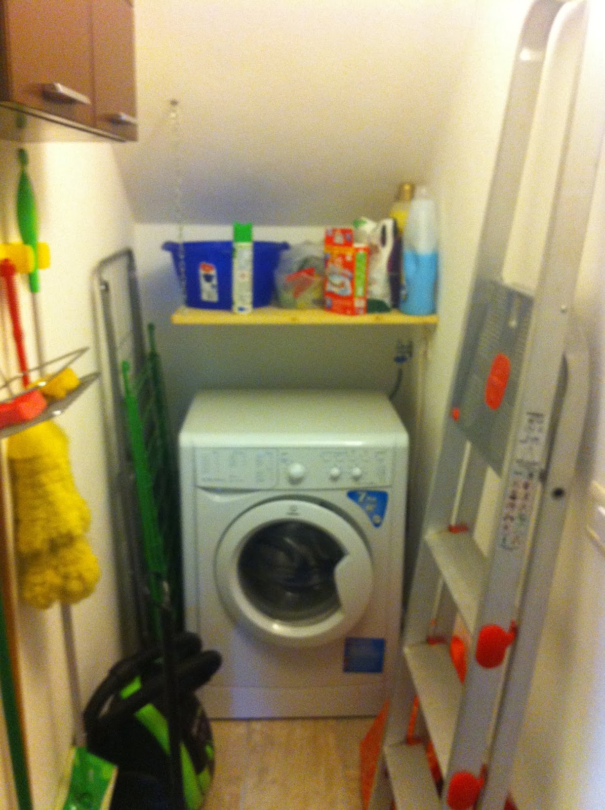 Abbiamo messo una porta bianca che sembra un armadio a due ante con due bei maniglioni per aprirla e poi...2 metri quadrati di spazio disponibile e super sfruttato. In fondo abbiamo posizionato la lavatrice, sopra ho fatto mettere una mensola dove posso appoggiare i detersivi, la cesta per le mollette e i bagnini. La mensola sulla sinistra è sostenuta da una catena che scende dall'alto in modo che ci sia dello spazio libero a lato della lavatrice in cui ho messo i due stendini. Contro la parete di destra ho appoggiato la scala e lì ci andrà anche l'asse da stiro, sulla sinistra ho appeso un pensile che contiene altri detersivi, stracci, spugne e sotto ho messo scope, spazzolone e piumino appesi a dei portascope in modo da lasciare spazio a terra per palettone e aspirapolvere.